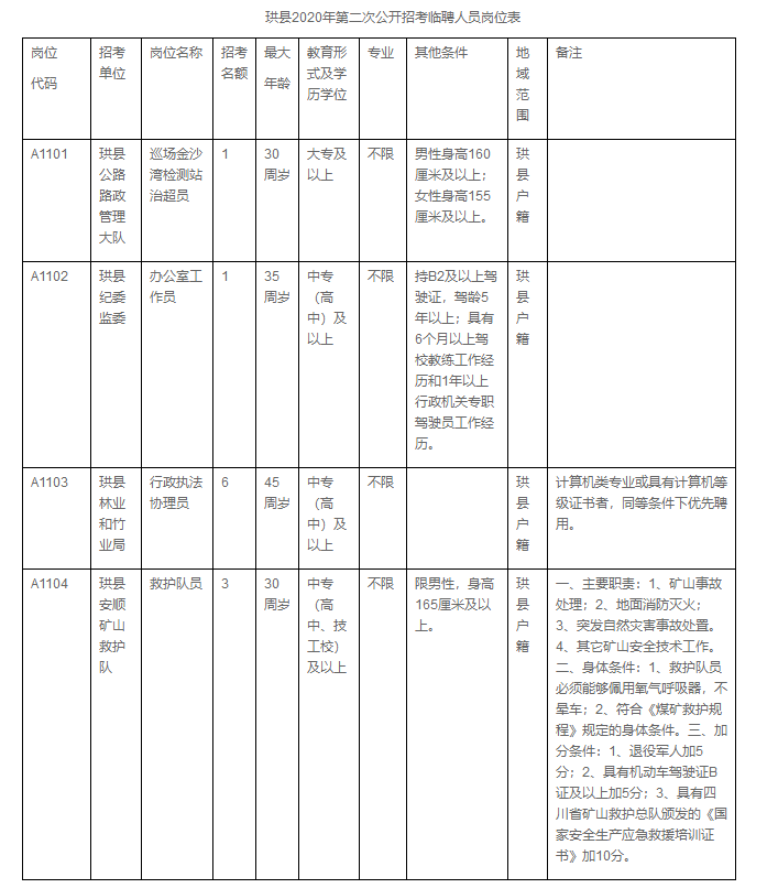 1.招考條件詳見《珙縣2020年第二次公開招考臨聘人員崗位表》。